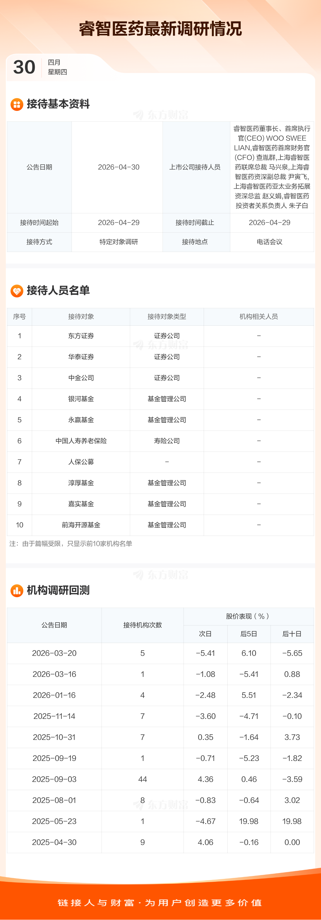 睿智医药4月30日公告称,4月29日接待东方证券等22家机构调研。接待人员包括睿智医药董事长、首席执行官(CEO) WOO SWEE LIAN,睿智医药首席财务官(CFO) 查胤群,上海睿智医药联席总裁 马兴泉,上海睿智医药资深副总裁 尹寅飞,上海睿智医药亚太业务拓展资深总监 赵义娟,睿智医药投资者关系负责人 朱子白。