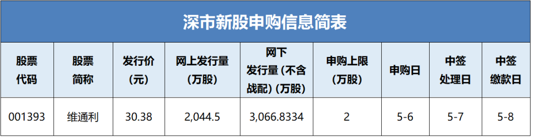 2026年5月6日,北京维通利电气股份有限公司(简称:维通利)将通过深交所网下发行电子平台和交易系统发行新股,具体信息如下。