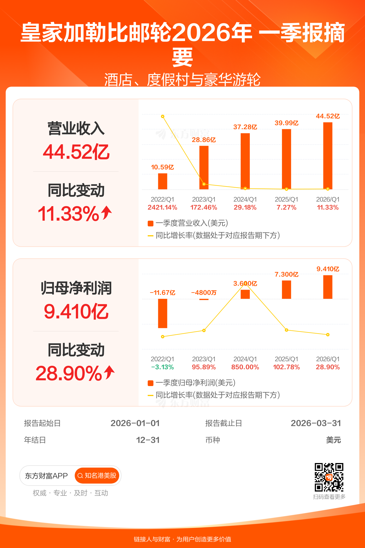 皇家加勒比邮轮4月30日发布一季报业绩,截至2026年3月31日的3个月内,该公司营业收入44.52亿美元,同比增长11.33%;公司权益持有人应占溢利(归母净利润)9.41亿美元,同比增长28.90%。