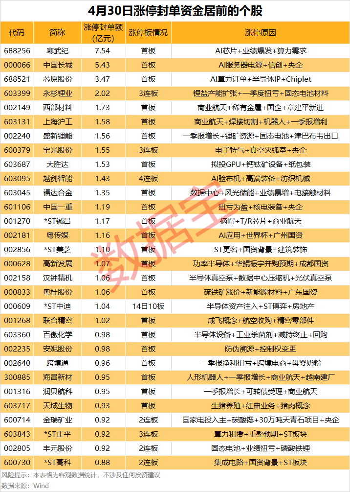 从连续涨停天数看,*ST中迪已连收8个涨停板,连续涨停板数量最多。以封单金额计算,寒武纪、中国长城、芯原股份等涨停板封单资金居前,分别有7.54亿元、5.43亿元、3.47亿元。