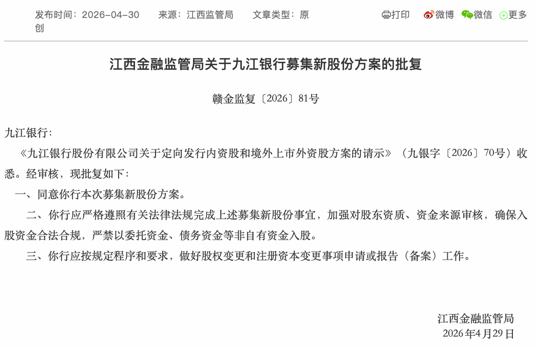 江西金融监管局:同意九江银行募集新股份方案