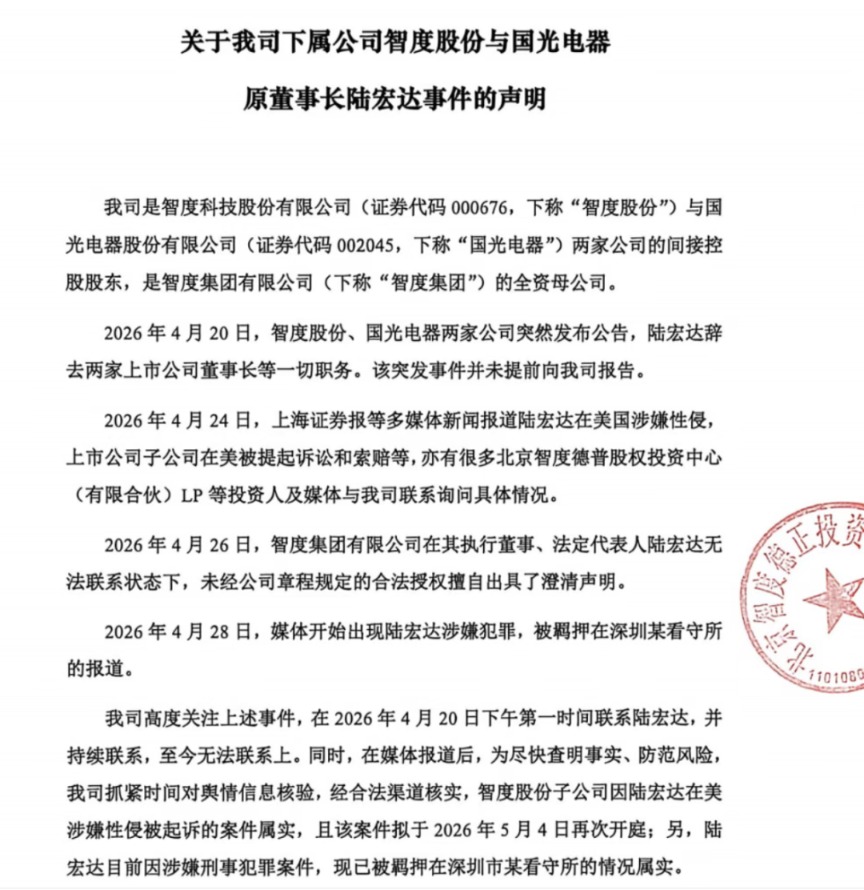 4月29日,北京智度德正投资有限公司(下称“智度德正”)在其微信服务号发布消息称,经合法渠道核实,智度股份子公司因陆宏达在美涉嫌性侵被起诉的案件属实,且该案件拟于2026年5月4日再次开庭;另,陆宏达目前因涉嫌刑事犯罪案件,现已被羁押在深圳市某看守所的情况属实。