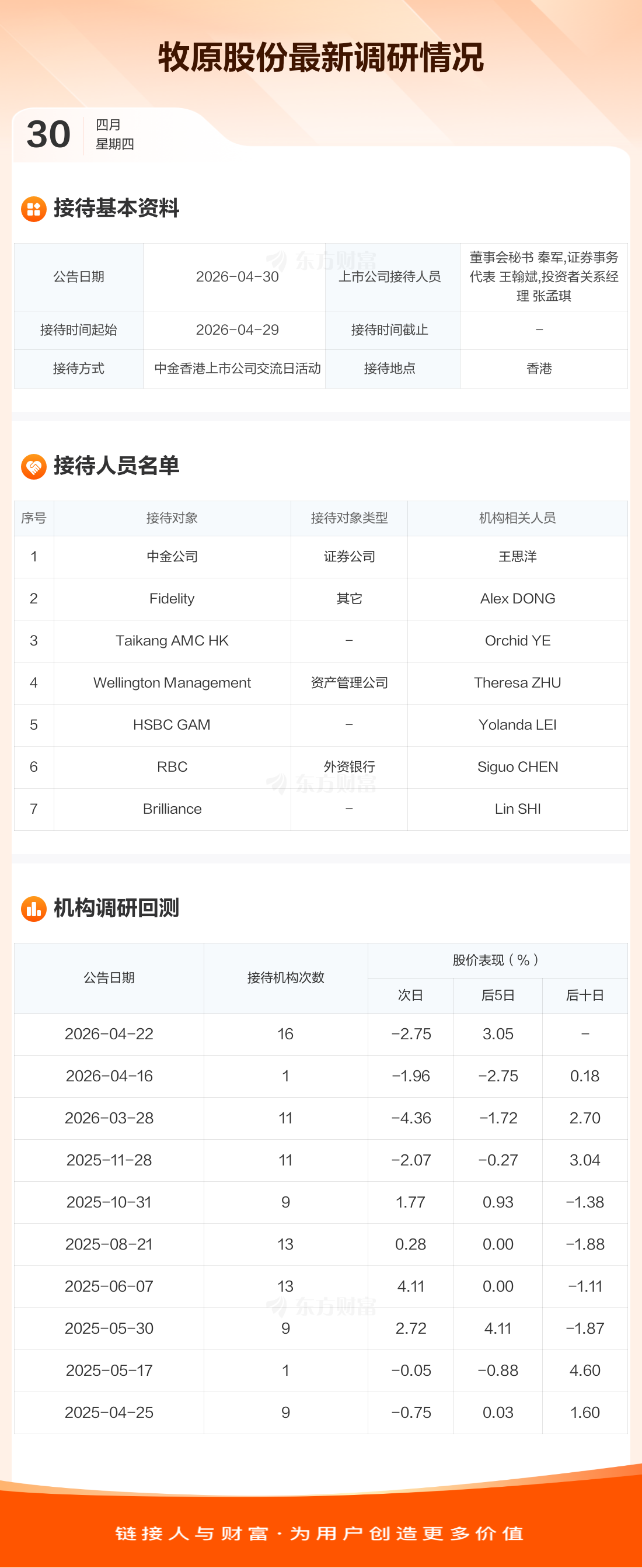 牧原股份4月30日公告称,4月29日接待中金公司等7家机构调研。接待人员包括董事会秘书 秦军,证券事务代表 王翰斌,投资者关系经理 张孟琪。