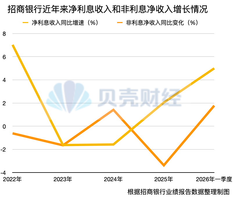 数据显示,招商银行零售信贷增速断崖式下降,信用卡板块也受到市场变化的影响,近几年的营收和利润的贡献占比也在下降。零售贷款的不良率从2022年的0.89%上升至2026年的1.14%。而财富管理手续费及佣金收入在2024年下降了22.70%,非息收入占比则从2022年末的36.70%下降至今年一季度的36.00%。