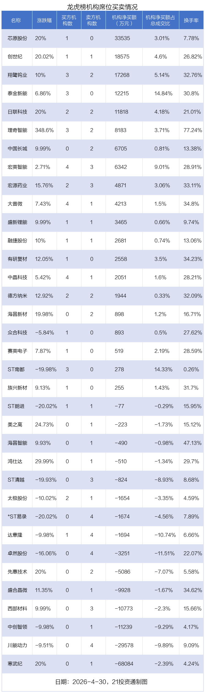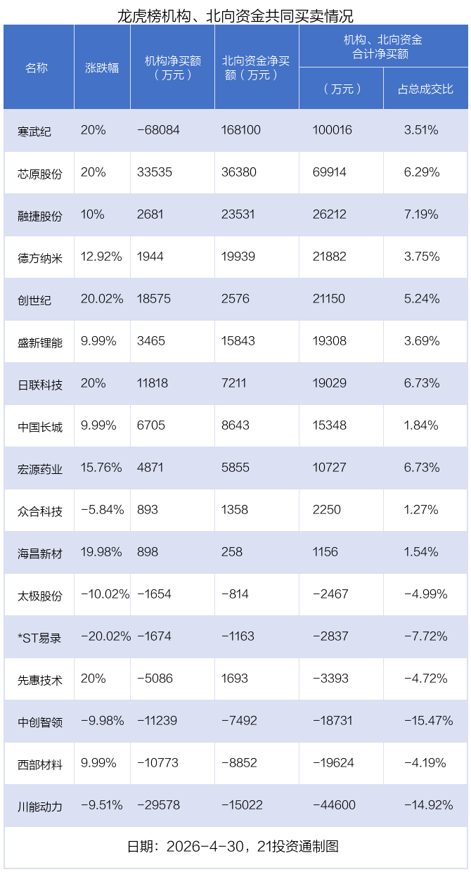 4月30日,35只个股龙虎榜出现了机构的身影,机构合计净卖出5818.36万元。具体来看,机构净买入20股,净卖出15股。