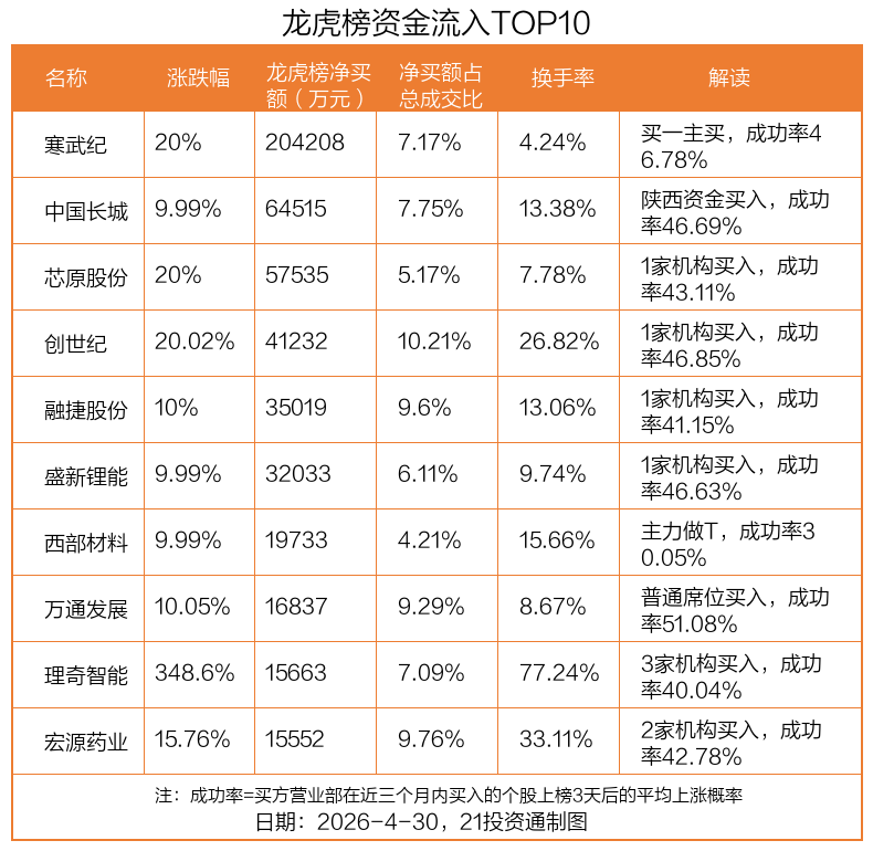 4月30日,上证指数上涨0.11%,深证成指下跌0.09%,创业板指下跌0.27%。盘后龙虎榜数据显示,共有61只个股因当日异动登上龙虎榜,资金净流入最多的是寒武纪(688256.SH),达20.42亿元。