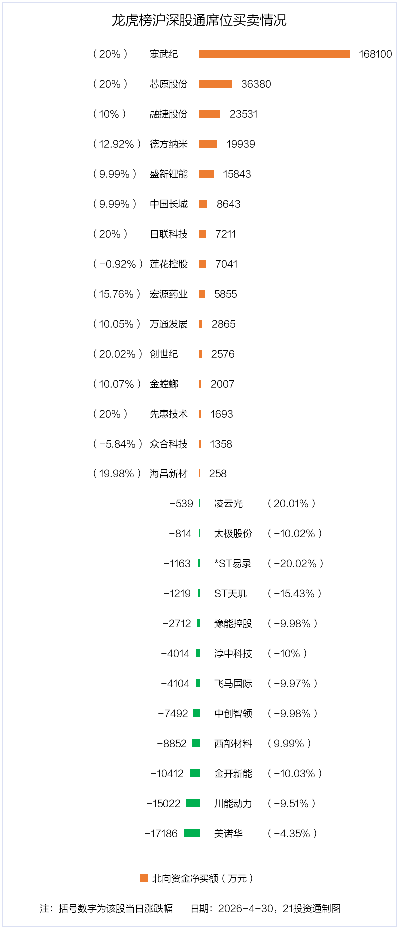 机构净卖出的个股中,金额最多的是寒武纪(688256.SH),当日收盘上涨20%,换手率为4.24%。
