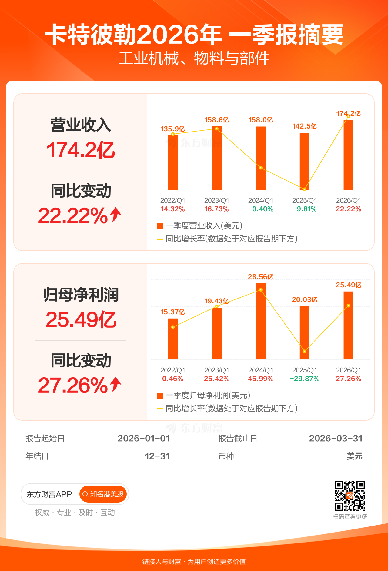 卡特彼勒4月30日发布一季报业绩,截至2026年3月31日的3个月内,该公司营业收入174.15亿美元,同比增长22.22%;公司权益持有人应占溢利(归母净利润)25.49亿美元,同比增长27.26%。