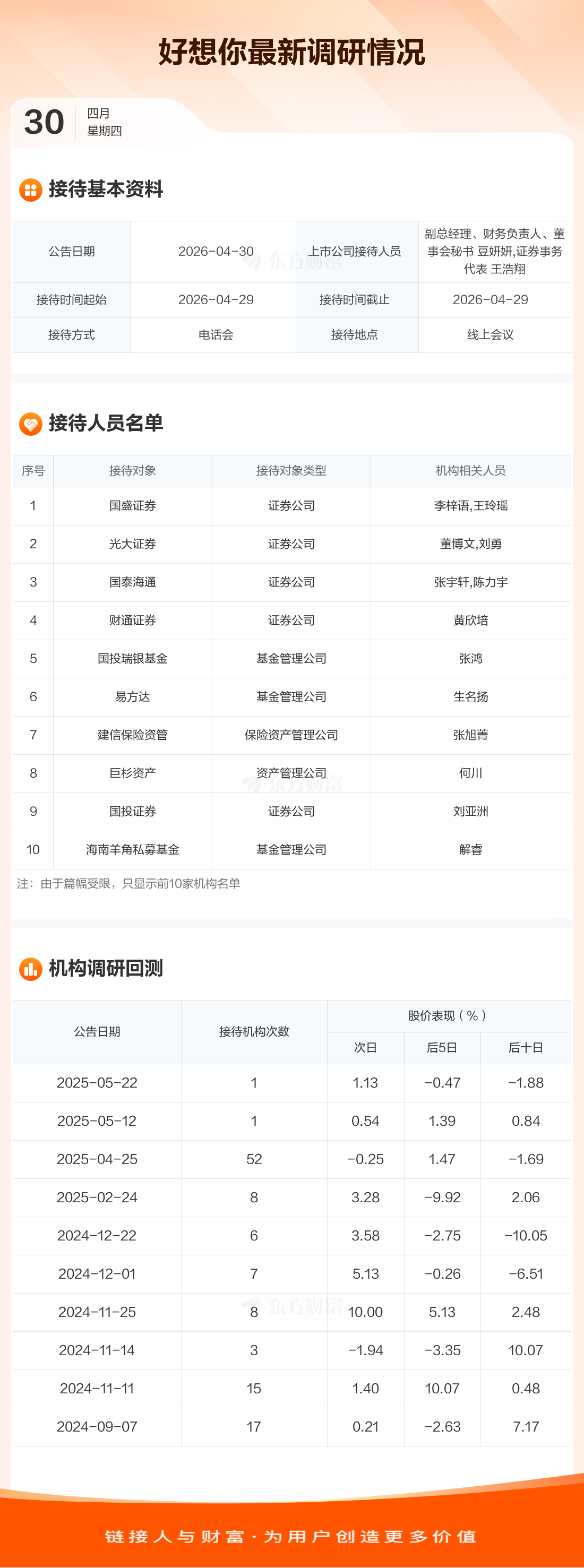 好想你4月30日公告称,4月29日接待国盛证券等31家机构调研。接待人员包括副总经理、财务负责人、董事会秘书 豆妍妍,证券事务代表 王浩翔。