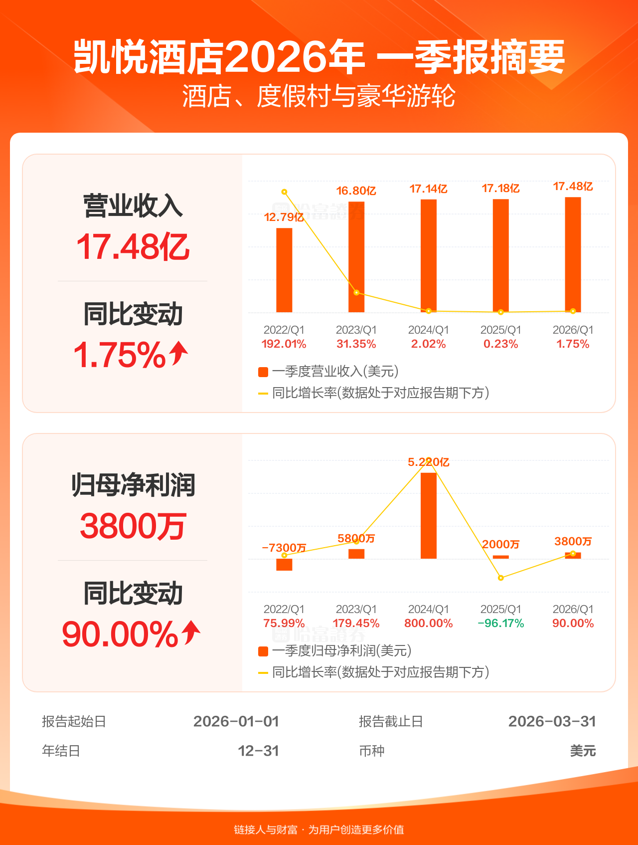 凯悦酒店4月30日发布一季报业绩,截至2026年3月31日的3个月内,该公司营业收入17.48亿美元,同比增长1.75%;公司权益持有人应占溢利(归母净利润)3800.00万美元,同比增长90.00%。