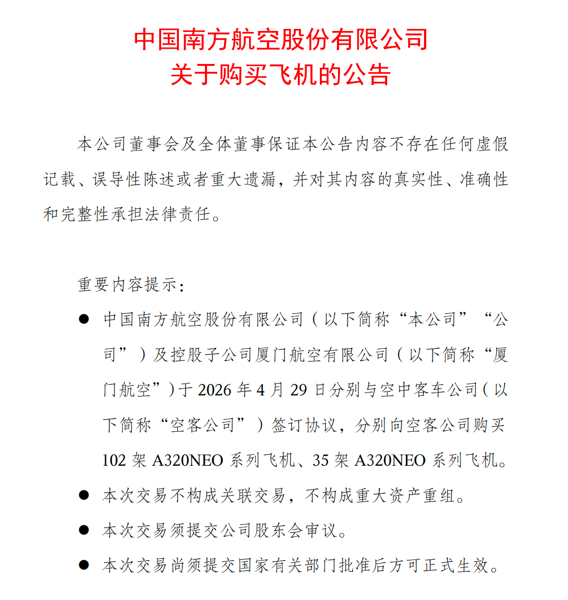 4月29日晚间,南航股份(600029.SH)发布公告称,公司及控股子公司厦门航空已分别与空客签署飞机购买协议,合计订购137架A320NEO系列飞机。
