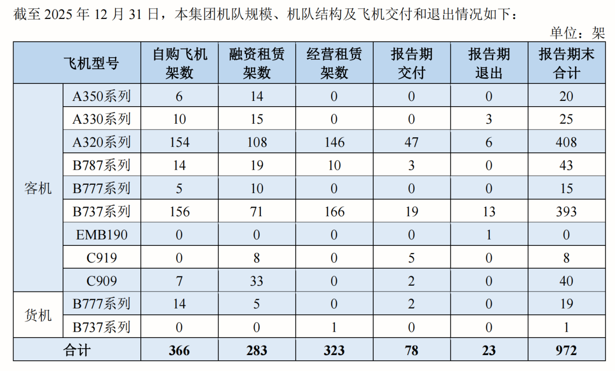 南航现役机队结构及2025年交付与退出情况(来源:南航2025年年报)