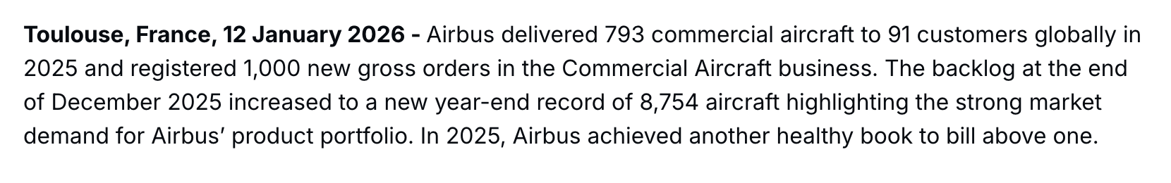 截至2025年底,空客报告全球商用飞机订单积压规模约为8754架。