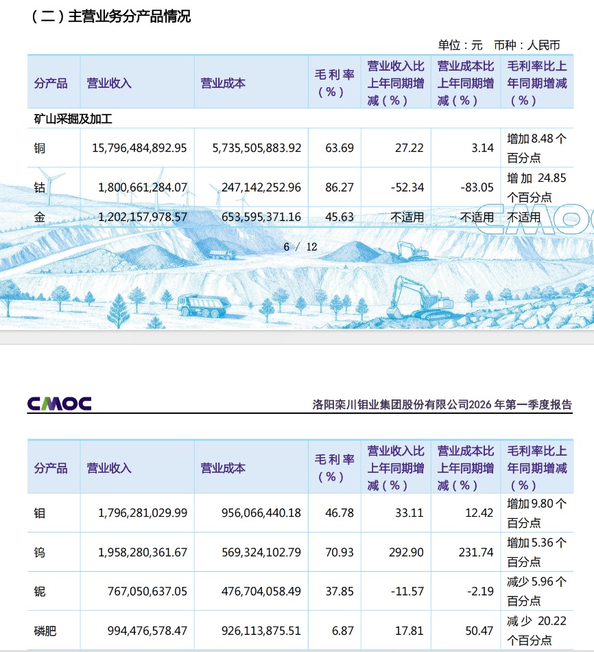洛阳钼业一季度的金属矿山毛利率整体处于较高水平,其中钴、钨、铜三大金属的毛利率均超过了60%。钴的毛利率达86.27%,同比提升24.85个百分点。