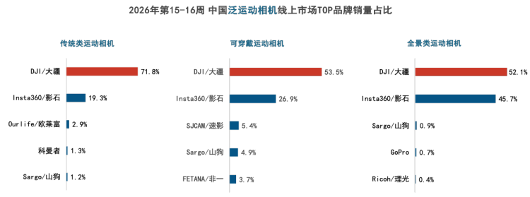 这股强劲势头,也体现在泛运动相机领域。根据洛图科技发布的《中国运动相机线上零售市场周度追踪》报告,2026年第15至16周(2026年4月6日至2026年4月19日),大疆在该领域以66.2%的合计销量份额位居第一,展现了无可争议的领导地位。