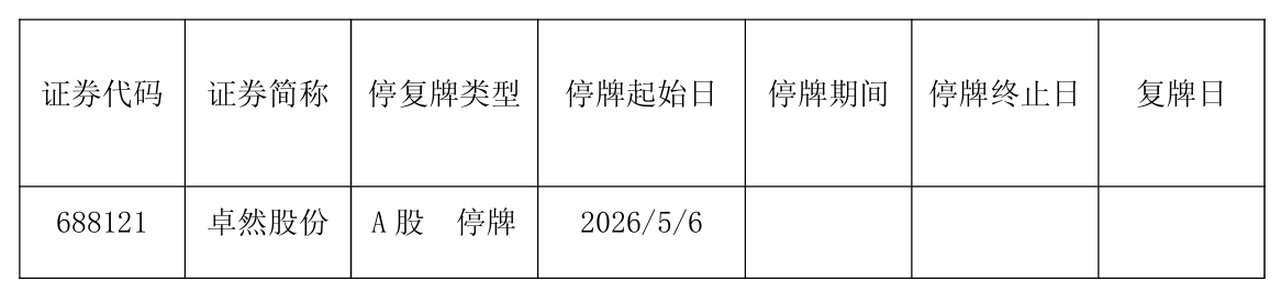 4月30日晚间,卓然股份(688121)发布公告称,公司无法在法定期限内完成《2025年年度报告》的披露工作,公司股票自2026年5月6日起停牌。若公司股票在停牌2个月内仍无法披露《2025年年度报告》,公司股票将被实施退市风险警示。