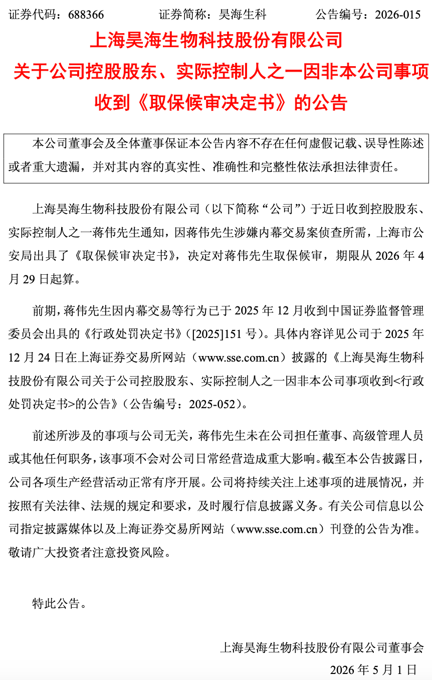 4月30日,昊海生科(688366)公告称,公司于近日收到控股股东、实际控制人之一蒋伟通知,因蒋伟涉嫌内幕交易案侦查所需,上海市公安局出具了《取保候审决定书》,决定对蒋伟取保候审,期限从2026年4月29日起算。