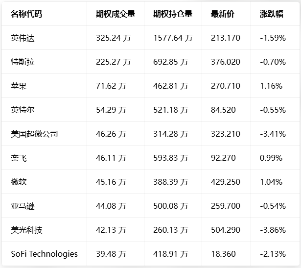 期权成交量前10的股票中,英特尔的看跌/看涨成交量比最高,达到0.76。