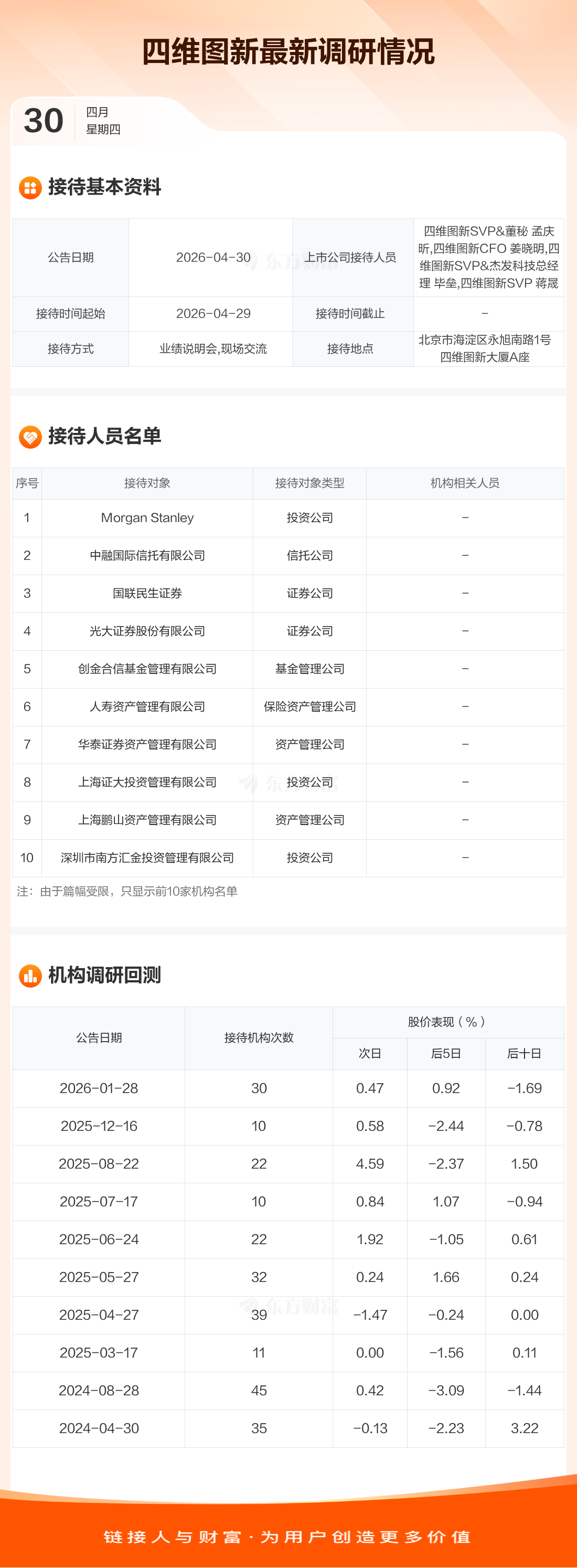 四维图新4月30日公告称,4月29日接待Morgan Stanley等28家机构调研。接待人员包括四维图新SVP&董秘 孟庆昕,四维图新CFO 姜晓明,四维图新SVP&杰发科技总经理 毕垒,四维图新SVP 蒋晟。