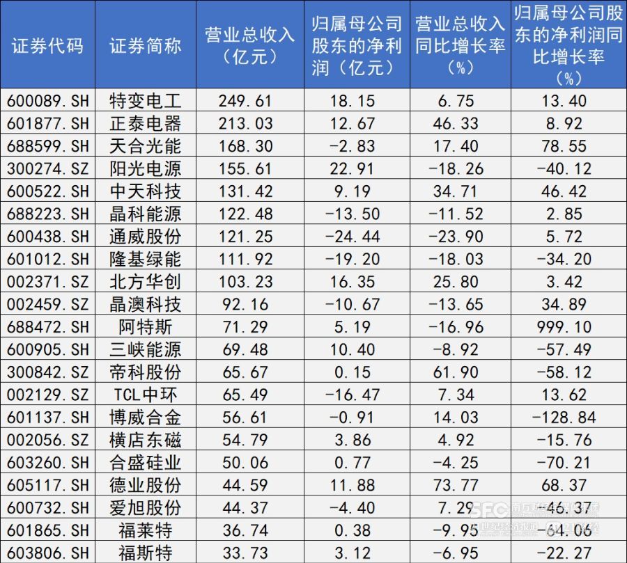 但也不乏一些营收和净利润双降的龙头企业。阳光电源(300274.SZ)、隆基绿能(601012.SH)、大全能源(688303.SH)等光伏制造环节的头部公司今年一季度遭遇业绩增长的压力。