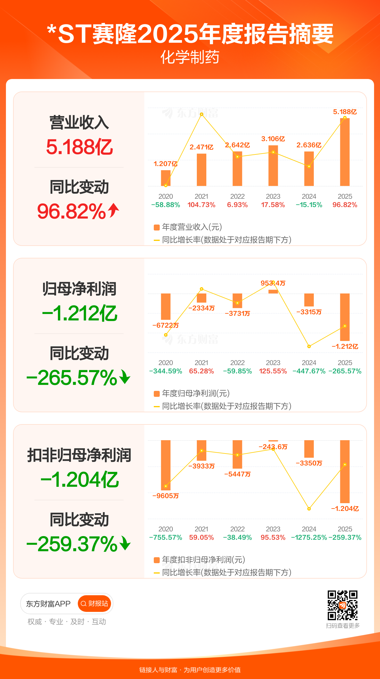 *ST赛隆4月30日发布2025年年报显示,公司全年实现营业收入5.19亿元,同比增长96.82%;归母净利润-1.21亿元;扣非归母净利润-1.20亿元。