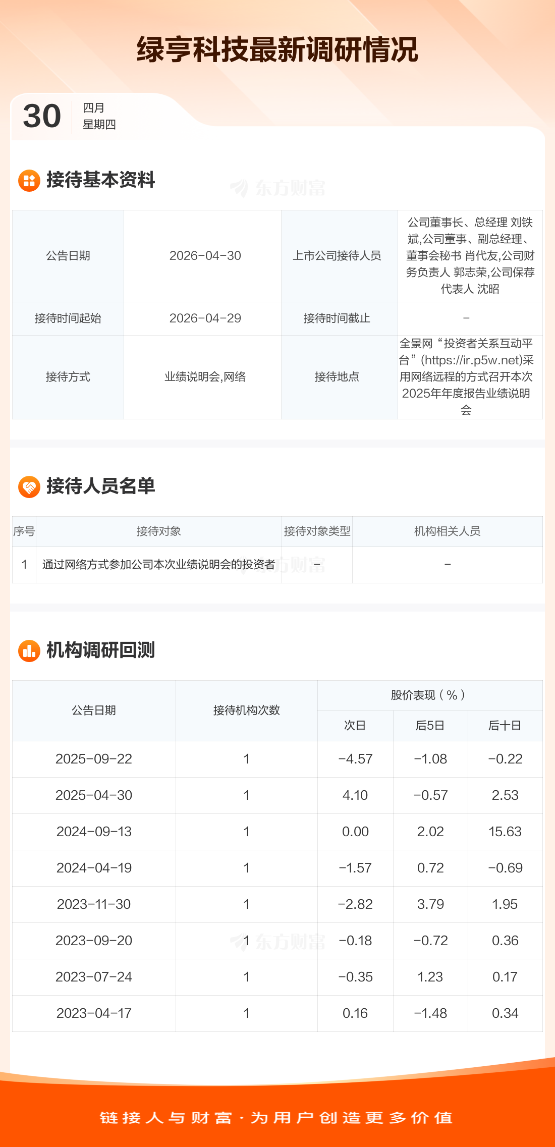 绿亨科技4月30日公告称,4月29日接待通过网络方式参加公司本次业绩说明会的投资者调研。接待人员包括公司董事长、总经理 刘铁斌,公司董事、副总经理、董事会秘书 肖代友,公司财务负责人 郭志荣,公司保荐代表人 沈昭。