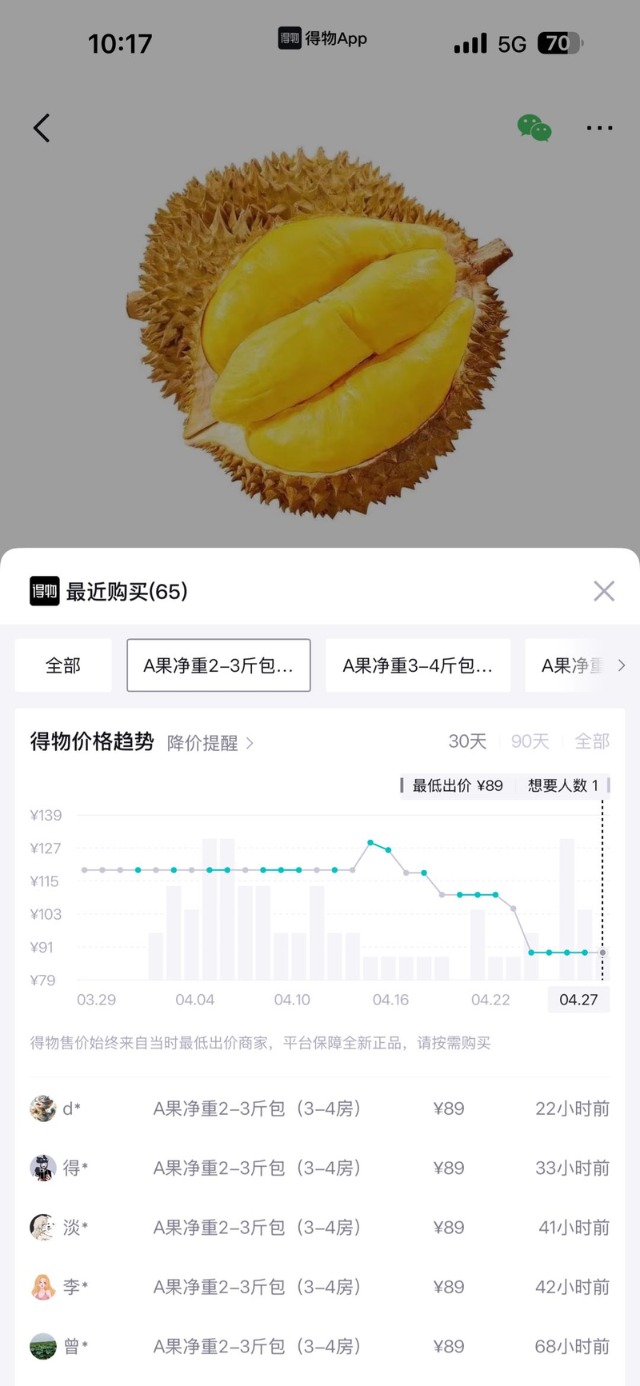榴莲价格走势。图/得物App