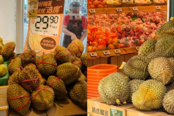 水果店将榴莲堆放在醒目位置。