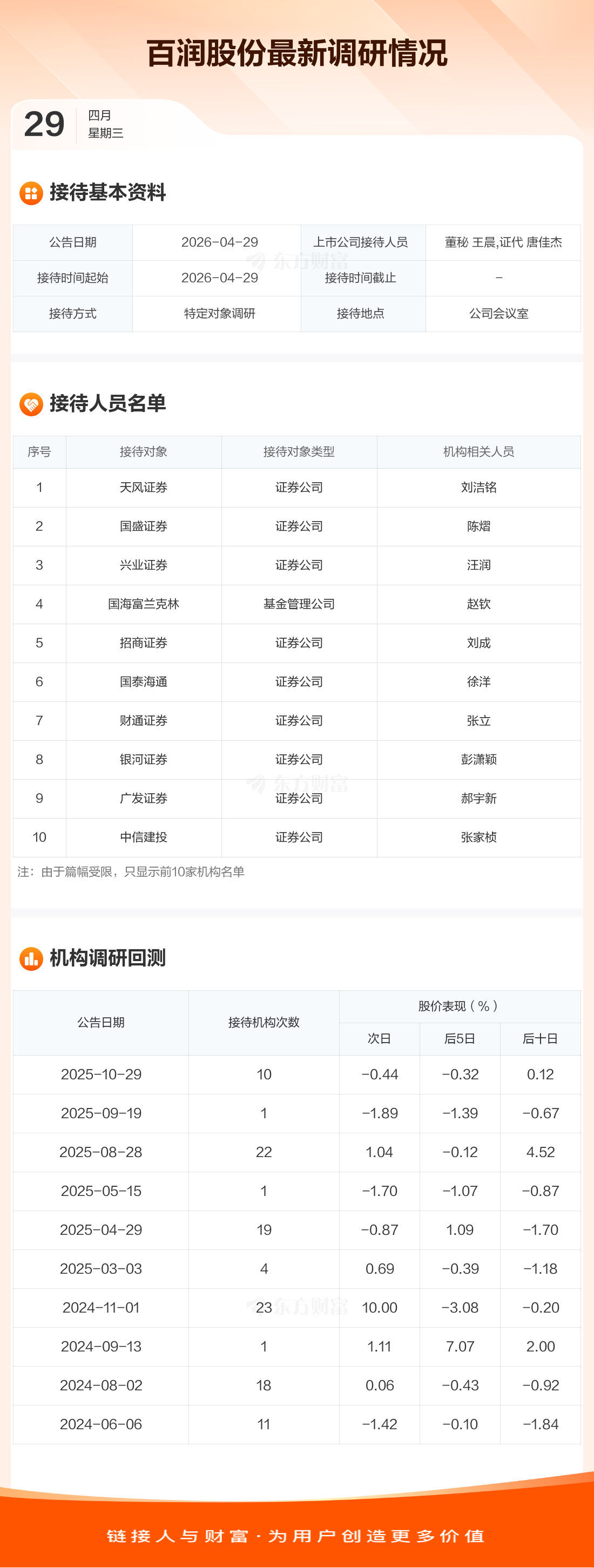 百润股份4月29日公告称,4月29日接待天风证券等12家机构调研。接待人员包括董秘 王晨,证代 唐佳杰。