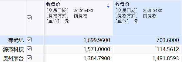 同花顺数据显示,贵州茅台(600519.SH)曾长期稳居A股“股王”。2025年4月30日,贵州茅台前复权股价为1491.86元/股,寒武纪和源杰科技分别仅为703.6元/股和114.56元/股。时隔一年,格局已然逆转,当前贵州茅台前复权股价回落至1384.79元/股,而寒武纪、源杰科技股价大幅上涨,分别达到1699.96元/股和1571元/股。