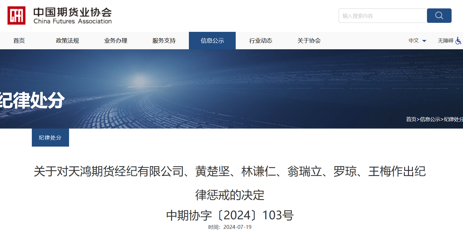 2024年7月,中期协发布纪律处分,黄楚坚存在作为天鸿期货的实际控制人和公司控股股东上海天美珠宝有限公司的实际控制人,不能在公司股东会中正常行使股东权利,在对有关决议持有异议下未按照规定主动、准确、完整地将有关情况通知天鸿期货以及违规让渡董事长职权的问题。