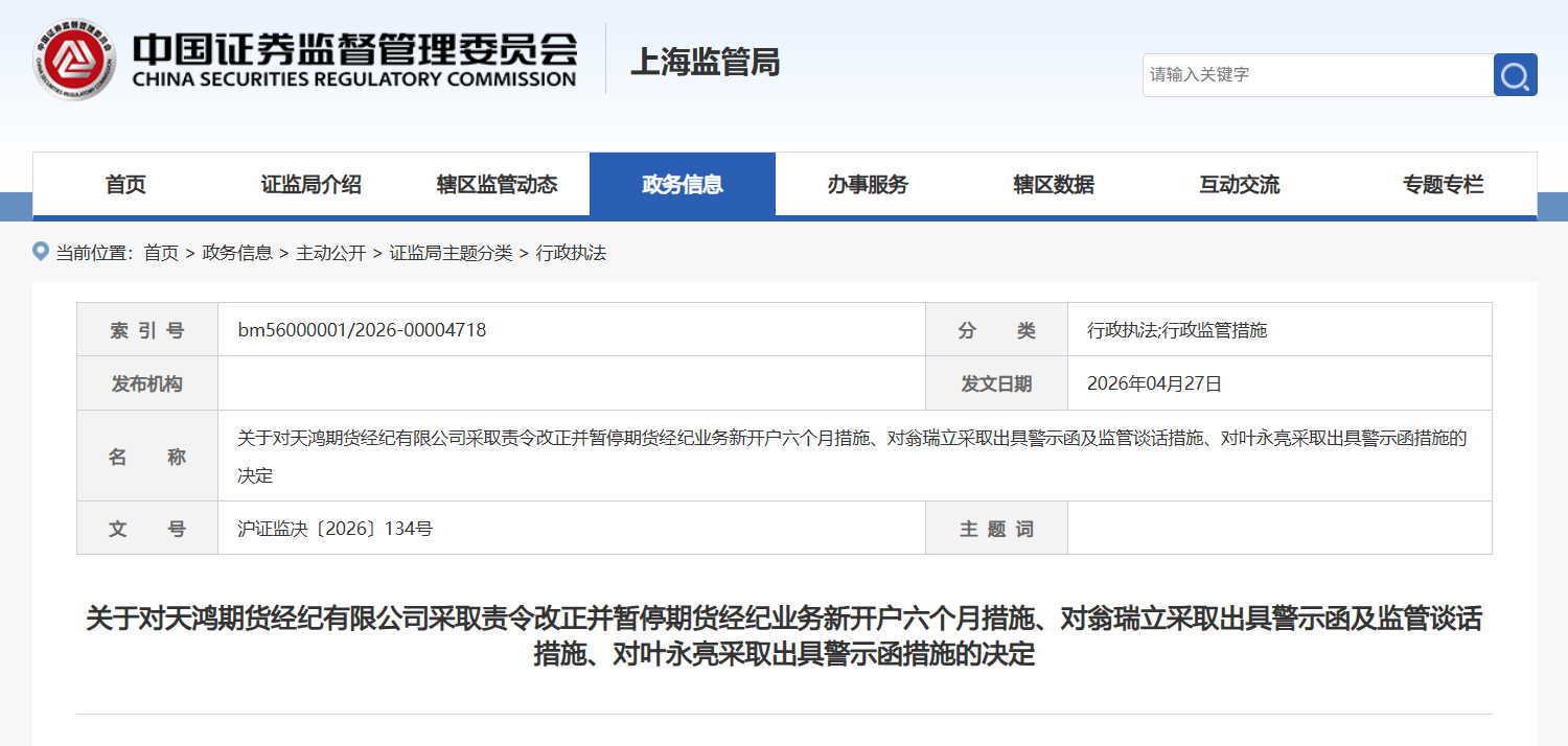 上证报中国证券网讯(记者费天元)4月30日,上海证监局披露行政监管措施,天鸿期货经纪有限公司因“治理和内部控制存在重大缺陷,不符合持续性经营规则,严重危及期货公司的稳健运行、损害交易者合法权益”,被暂停期货经纪业务新开户六个月,另有两位公司管理层被出具警示函。