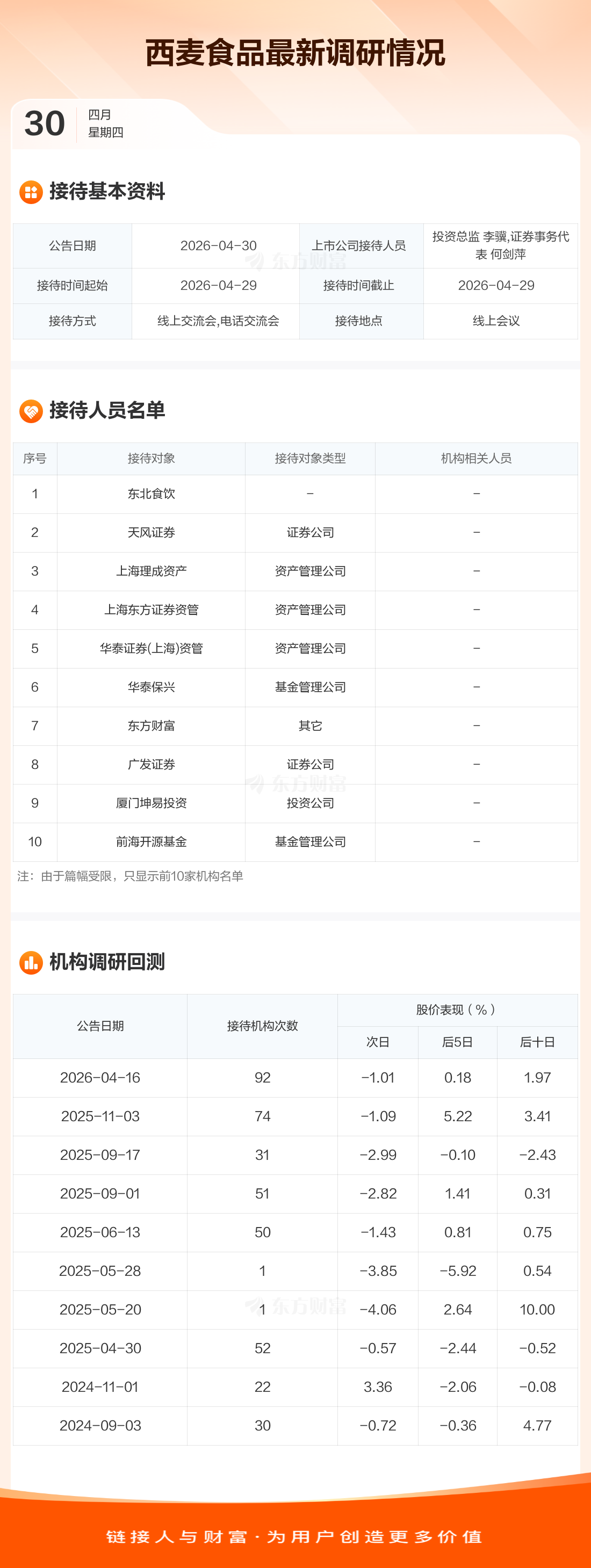 西麦食品4月30日公告称,4月29日接待东北食饮等62家机构调研。接待人员包括投资总监 李骥,证券事务代表 何剑萍。