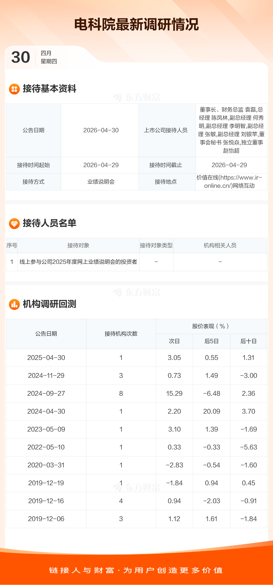 电科院4月30日公告称,4月29日接待线上参与公司2025年度网上业绩说明会的投资者调研。接待人员包括董事长、财务总监 袁磊,总经理 陈凤林,副总经理 何秀明,副总经理 李明智,副总经理 张敏,副总经理 刘银苹,董事会秘书 张悦焱,独立董事 赵怡超。