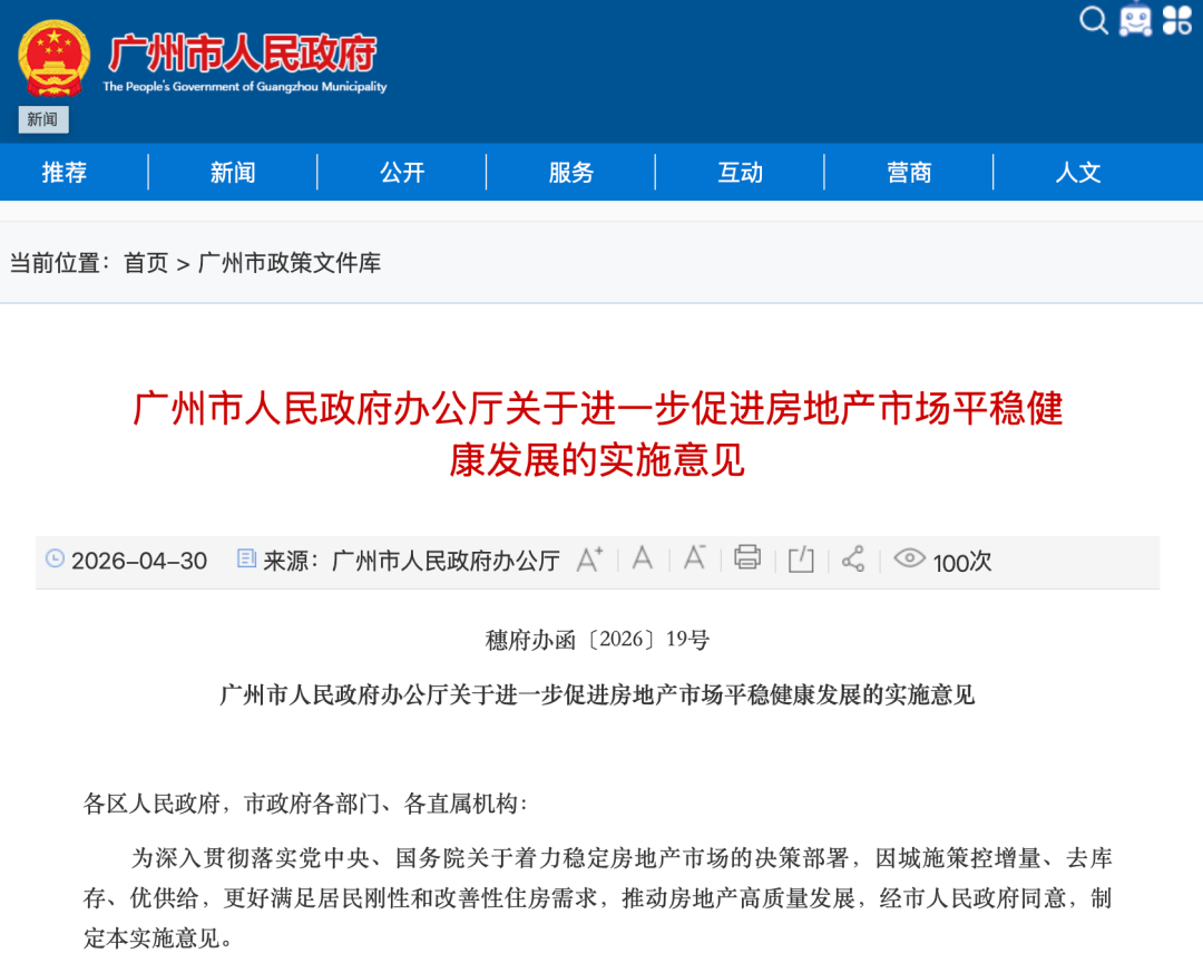 同日,广州市人民政府办公厅对外发布了关于进一步促进房地产市场平稳健康发展的实施意见。