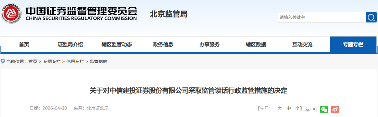 根据相关规定,北京证监局决定对中信建投采取监管谈话的行政监管措施,并要求其主要负责人按指定日期前往北京证监局接受监管谈话。