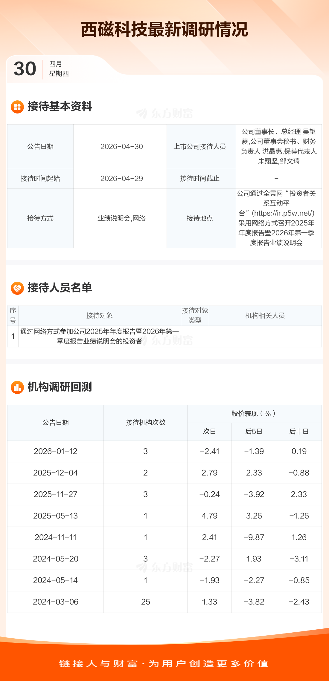 西磁科技4月30日公告称,4月29日接待通过网络方式参加公司2025年年度报告暨2026年第一季度报告业绩说明会的投资者调研。接待人员包括公司董事长、总经理 吴望蕤,公司董事会秘书、财务负责人 洪晶惠,保荐代表人 朱翔坚,邹文琦。