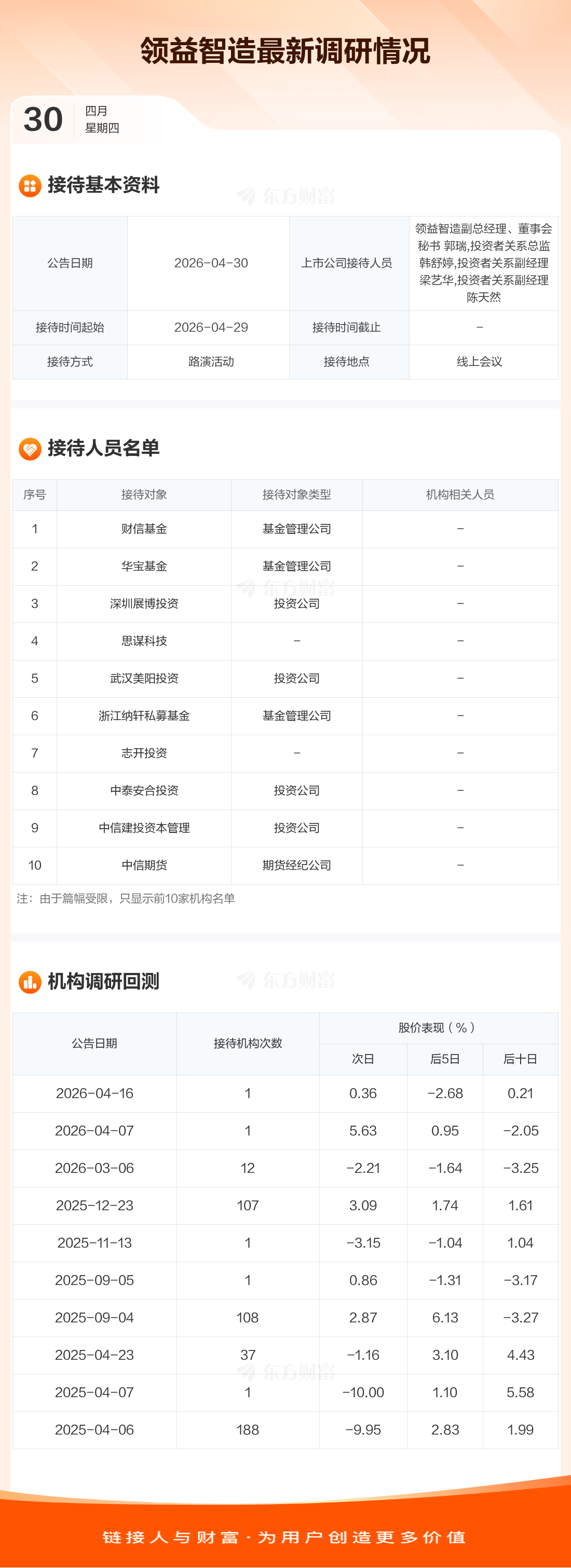 领益智造4月30日公告称,4月29日接待财信基金等115家机构调研。接待人员包括领益智造副总经理、董事会秘书 郭瑞,投资者关系总监 韩舒婷,投资者关系副经理 梁艺华,投资者关系副经理 陈天然。