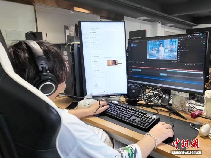 近日,影视从业者剪辑AI视频。刘子琳摄