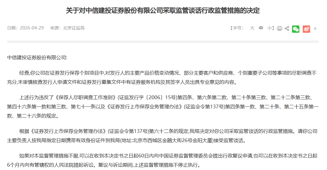 上述行为违反了有关规定,北京证监局决定对中信建投证券采取监管谈话的行政监管措施。北京证监局要求中信建投证券主要负责人按指定日期携带有效身份证件到该局接受监管谈话。