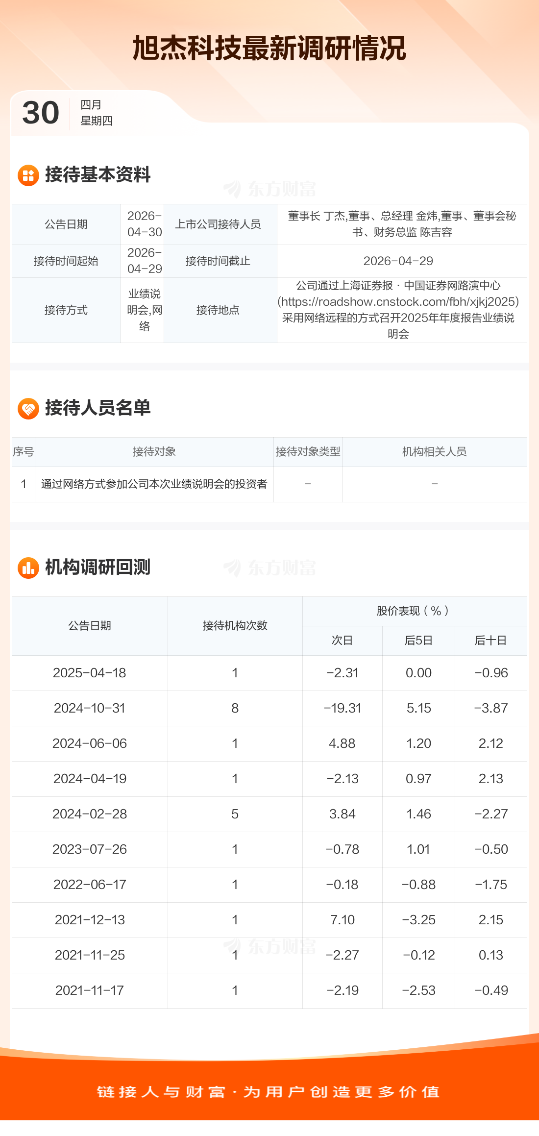 旭杰科技4月30日公告称,4月29日接待通过网络方式参加公司本次业绩说明会的投资者调研。接待人员包括董事长 丁杰,董事、总经理 金炜,董事、董事会秘书、财务总监 陈吉容。