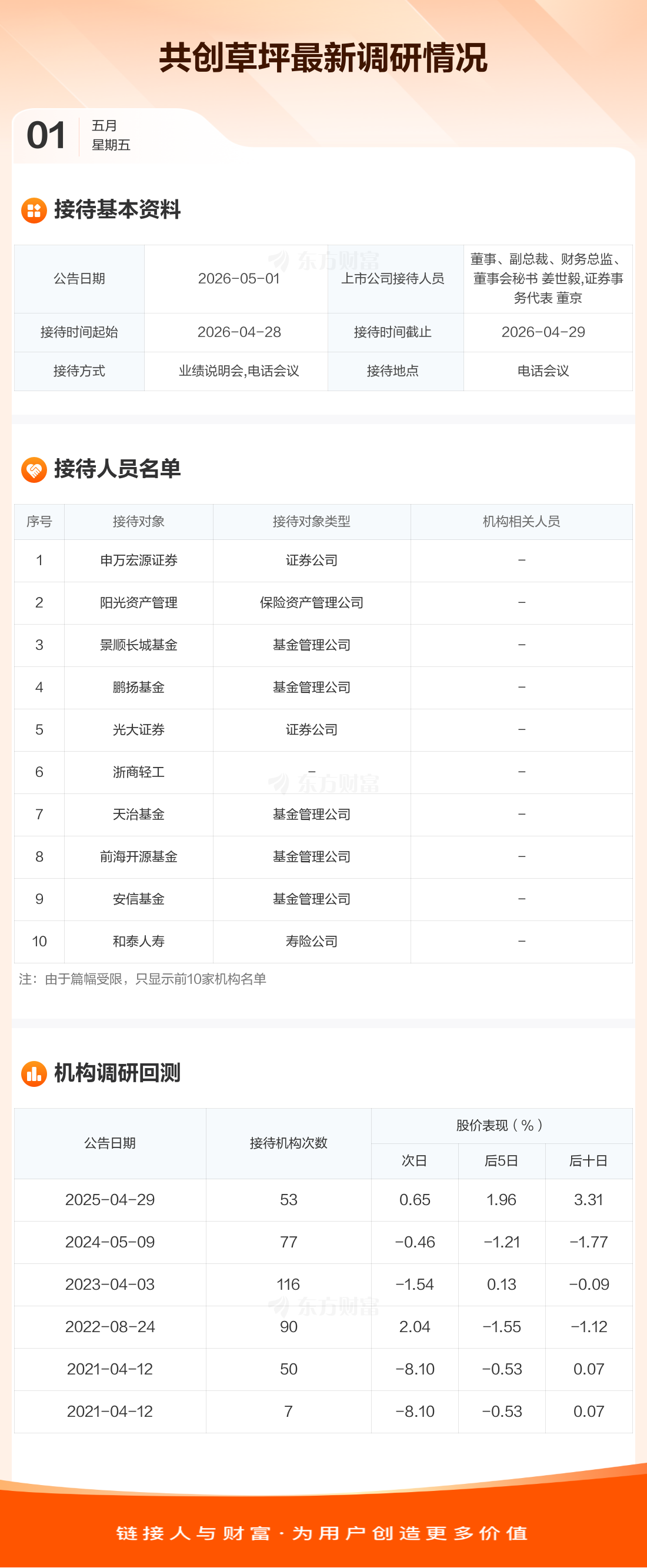 共创草坪5月1日公告称,4月28日至4月29日接待申万宏源证券等51家机构调研。接待人员包括董事、副总裁、财务总监、董事会秘书 姜世毅,证券事务代表 董京。