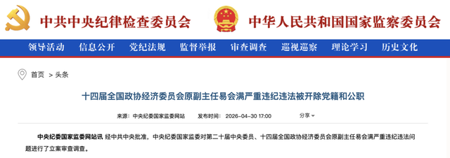 4月30日,据中央纪委国家监委消息:经中共中央批准,中央纪委国家监委对第二十届中央委员、十四届全国政协经济委员会原副主任易会满严重违纪违法问题进行了立案审查调查。