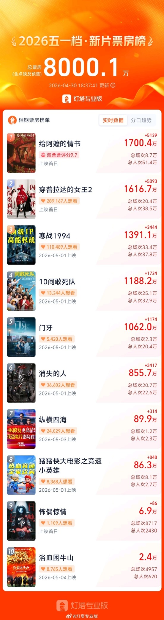 4月30日,据灯塔专业版,2026年五一档新片总票房(含点映及预售)突破8000万,《给阿嬷的情书》《穿普拉达的女王2》《寒战1994》暂列前三位 。