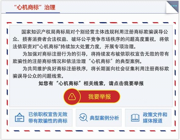 国家知识产权局副局长芮文彪近日在国新办发布会上表示,对“心机商标”问题,正在采取有力措施进行专项整治。记者注意到,国家知识产权局商标局中国商标网已上线“心机商标”治理版块。