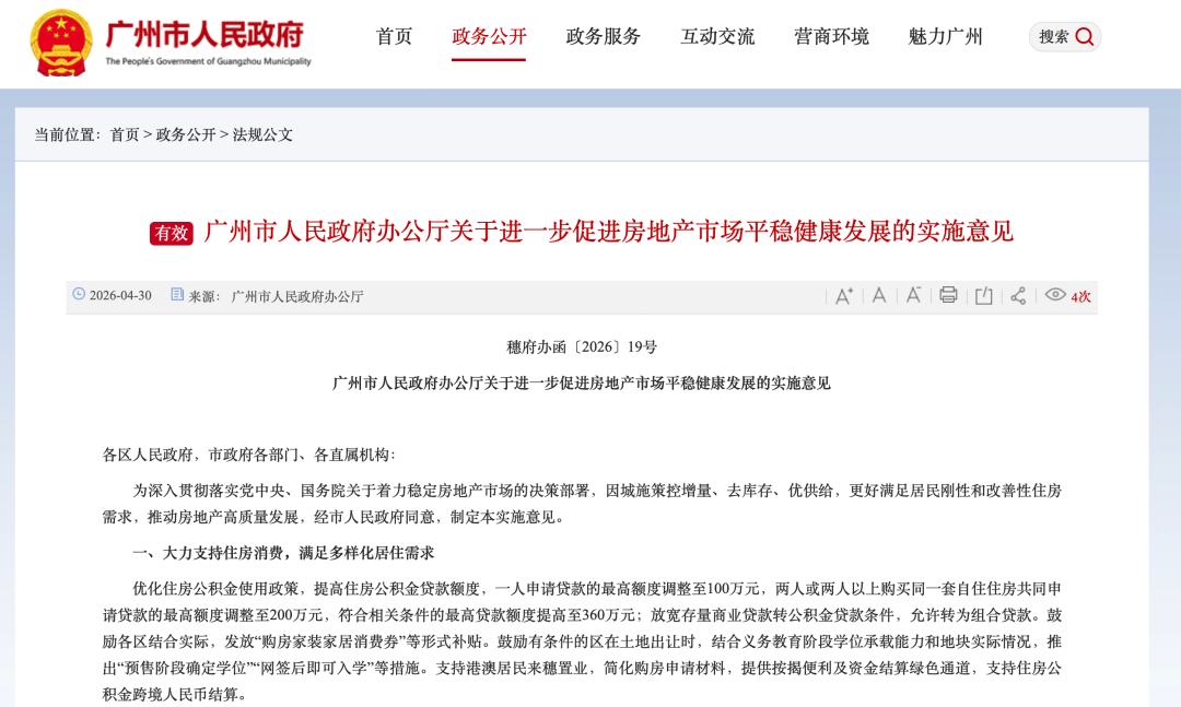 4月30日下午,广州市发布一揽子楼市支持措施,包括提高公积金贷款额度、设立总额2亿的个人“卖旧换新”置换专项补贴、鼓励部分区域新房预售阶段确定学位等措施,全文如下: