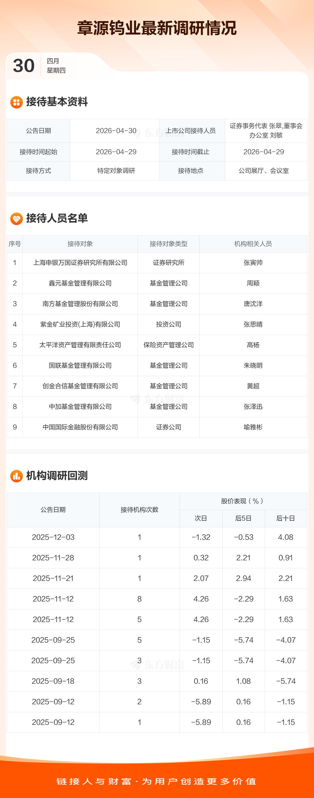 章源钨业4月30日公告称,4月29日接待上海申银万国证券研究所有限公司等9家机构调研。接待人员包括证券事务代表 张翠,董事会办公室 刘敏。