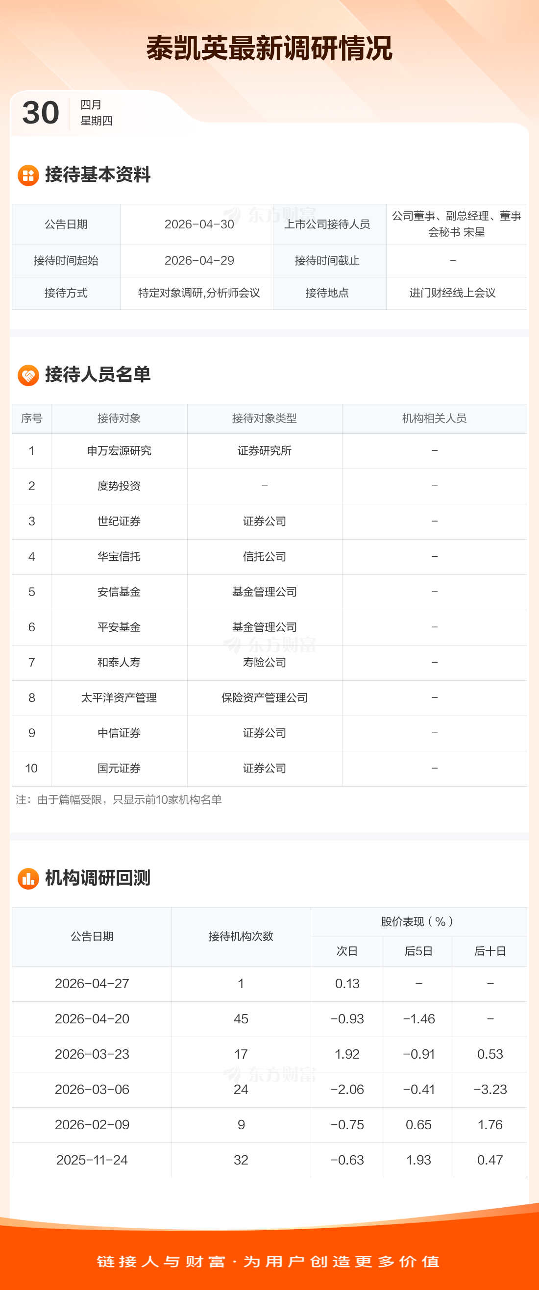 【调研快报】泰凯英接待申万宏源研究等13家机构调研
