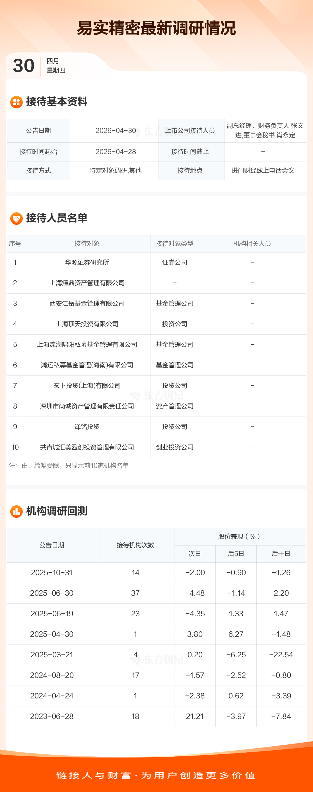 易实精密4月30日公告称,4月28日接待华源证券研究所等26家机构调研。接待人员包括副总经理、财务负责人 张文进,董事会秘书 肖永定。