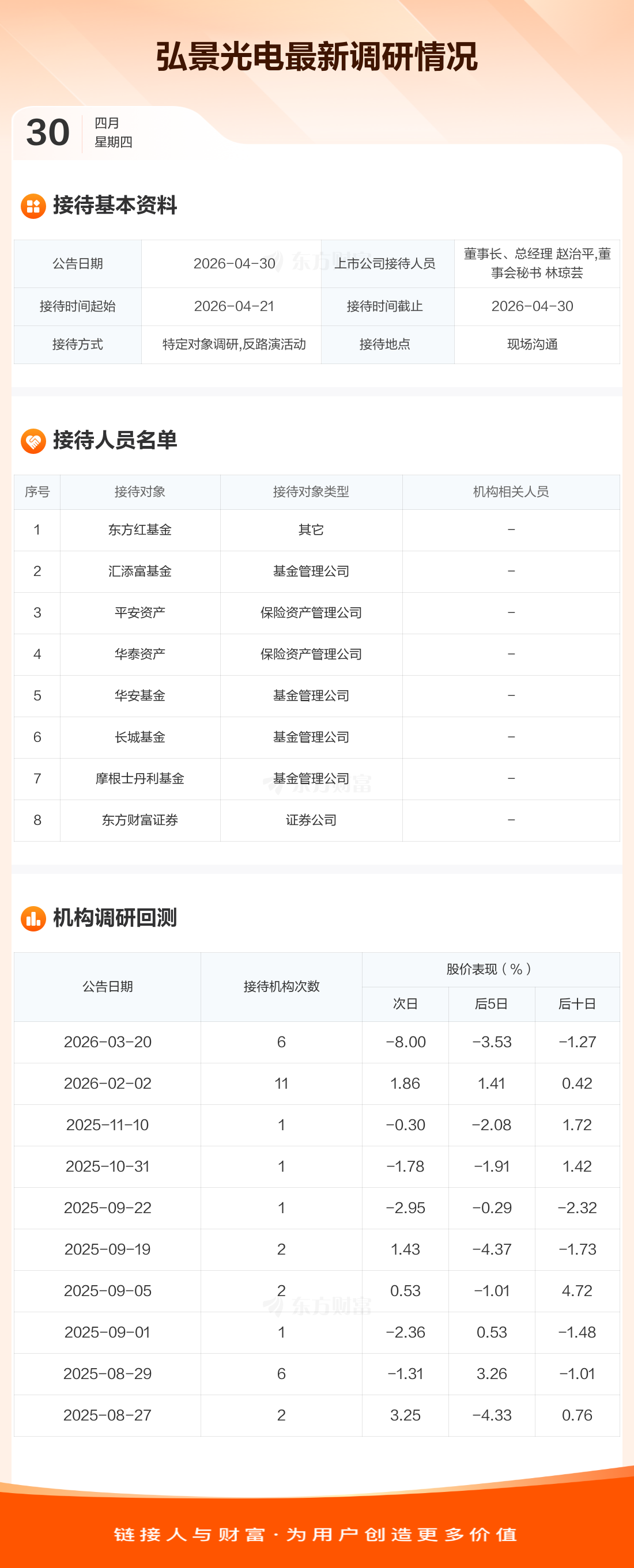 弘景光电4月30日公告称,4月21日至4月30日接待东方红基金等8家机构调研。接待人员包括董事长、总经理 赵治平,董事会秘书 林琼芸。